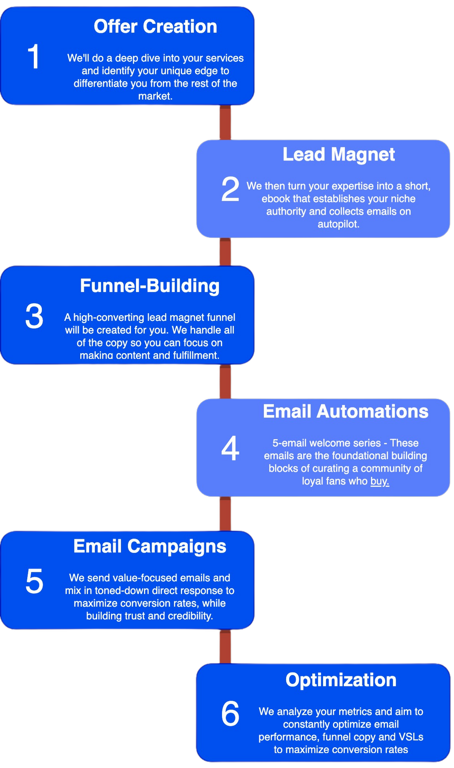 Most email marketers will flood your audience's inbox with fake scarcity (3 spots left!), pitch their offers on every email without providing any value, and write boring copy that churns their list. We solve all of this with engaging relationship-building emails that convert.